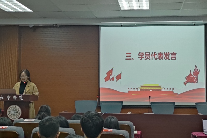 紧接着,2020级历史学师范专业金怡雯同学作为学员代表发言。她以“习近平的扶贫故事”为主题,呼吁每一位积极向党组织靠拢的青年都能以满腔热血投入学习中,努力提高自身思想政治素养和道德修养。她提出,青年学子要树立为人民服务的思想意识,不断充实完善自己,为加入中国共产党做好充分准备。